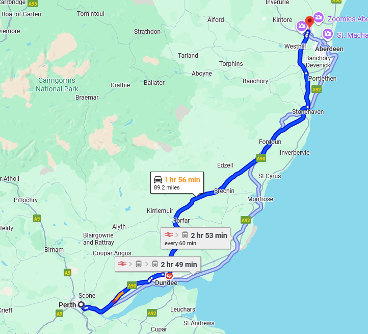 From Perth to Aberdeen Airport (ABZ) is around 90 miles and can be expected to take just under two hours.