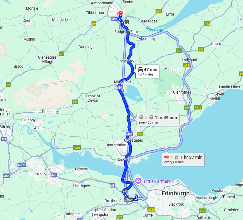 Perth to Edinburgh Airport (EDI) It's around 40 miles from Perth to Edinburgh Airport (EDI), taking approximately 50 minutes. Call us for an idea of the cost.